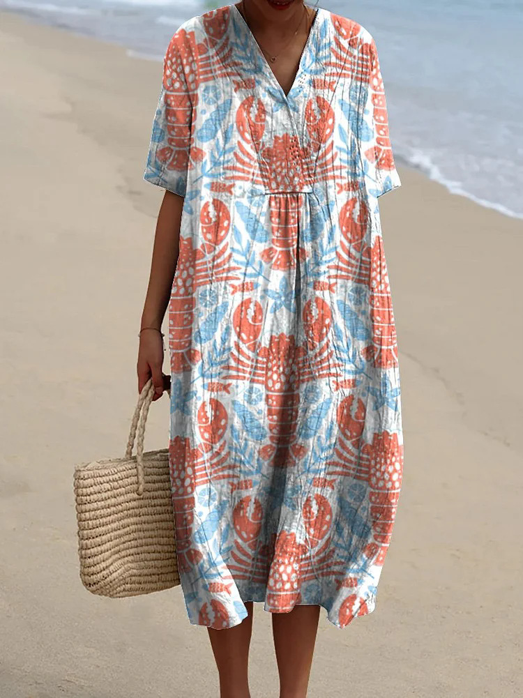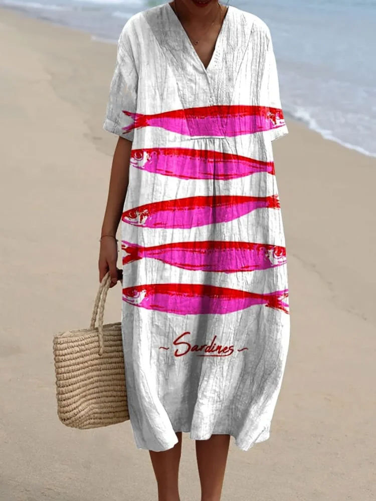 Kasandra überzeugt mit einem fließenden Schnitt und einem außergewöhnlichen Fischmotiv, das jedem Outfit eine kreative Note verleiht. Das Kleid kombiniert stilvolle Lässigkeit mit besonderem Design und ist ideal für warme Sommertage. Der weiche Stoff fällt sanft und umspielt die Figur – perfekt für Spaziergänge, Freizeit oder Events mit Charakter. Kasandra ist ideal für alle, die Mode lieben, die auffällt und bewegt.