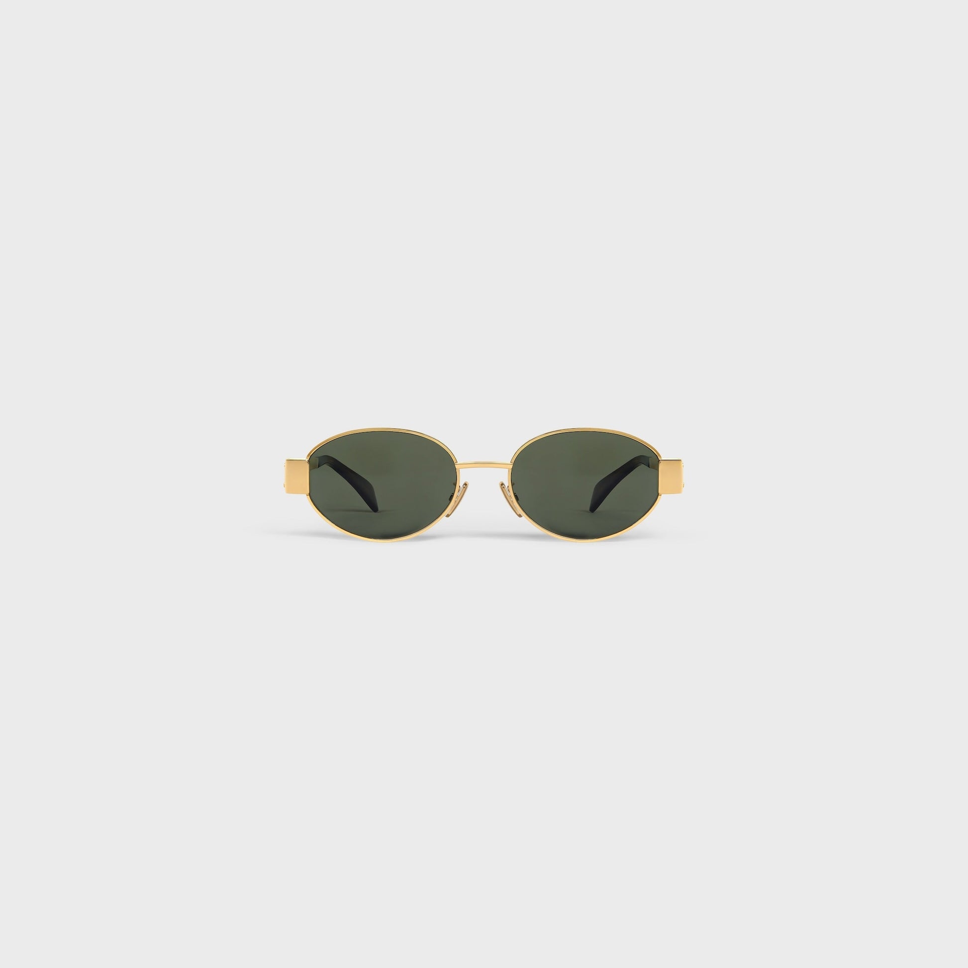 Ein edles Statement: Diese ovale Sonnenbrille von CELINE vereint zeitlose Eleganz mit luxuriösen Details. Das goldfarbene Metallgestell strahlt Raffinesse aus, während die dunkelgrünen Gläser einen klassischen Look mit modernem Flair bieten. Das Highlight: Das ikonische Triomphe-Logo ist beidseitig auf den breiten Bügeln eingraviert – ein unverkennbares Symbol für französische Designkunst.